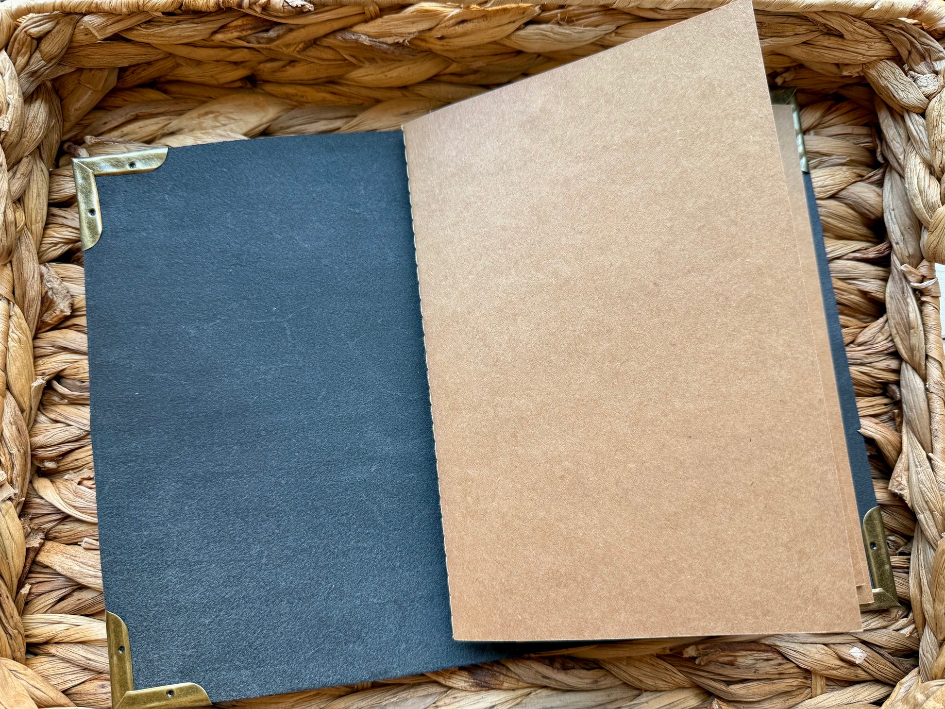 This handcrafted journal is made from thick, durable black leather and finished with sleek metal corners for added strength and style. A soft gray ribbon closure adds a subtle contrast and elegant touch. Inside, it holds three removable signature inserts — perfect for customizing, refilling, and adapting to your journaling journey.