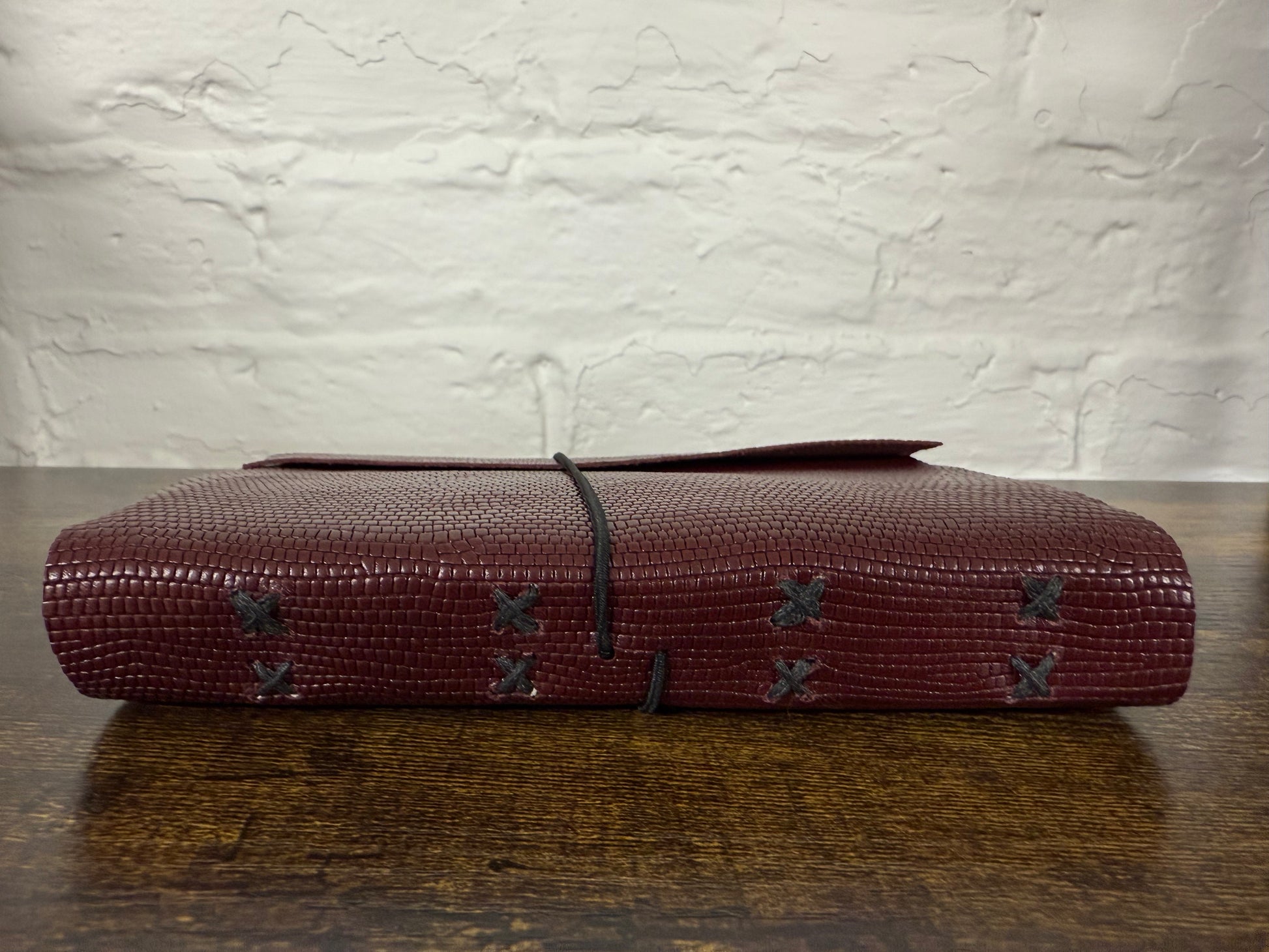 This handmade journal features a bold red embossed leather cover complemented by a sleek black elastic closure for easy use. Hand-sewn with attention to detail, it contains 104 pages of smooth, 68 lb paper — perfect for writing, sketching, or daily notes. A striking blend of style and functionality crafted to inspire.