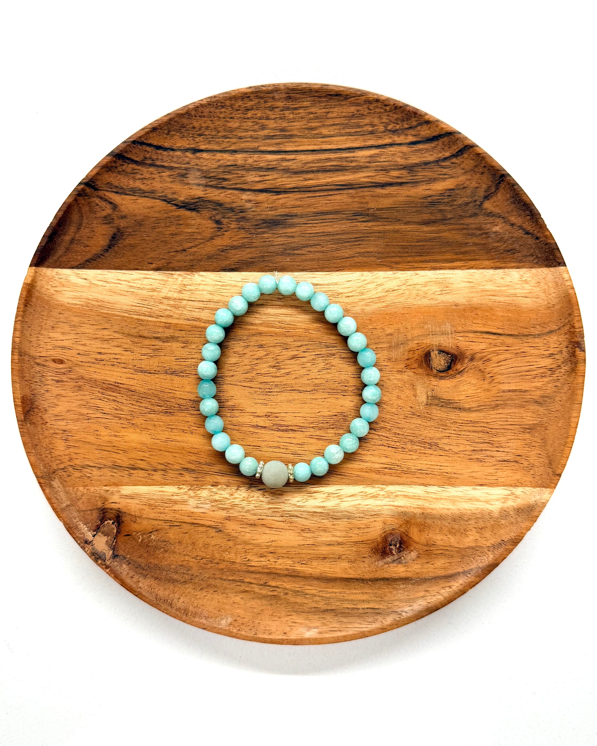 Add a splash of serene turquoise to your accessory collection with this elegant beaded bracelet. Crafted from milky turquoise beads, it features a contrasting larger bead at the center, adorned with subtle metallic accents. Perfect for casual or semi-formal wear, this bracelet offers a blend of simplicity and charm. It's an ideal gift for someone who loves delicate, colorful jewelry.