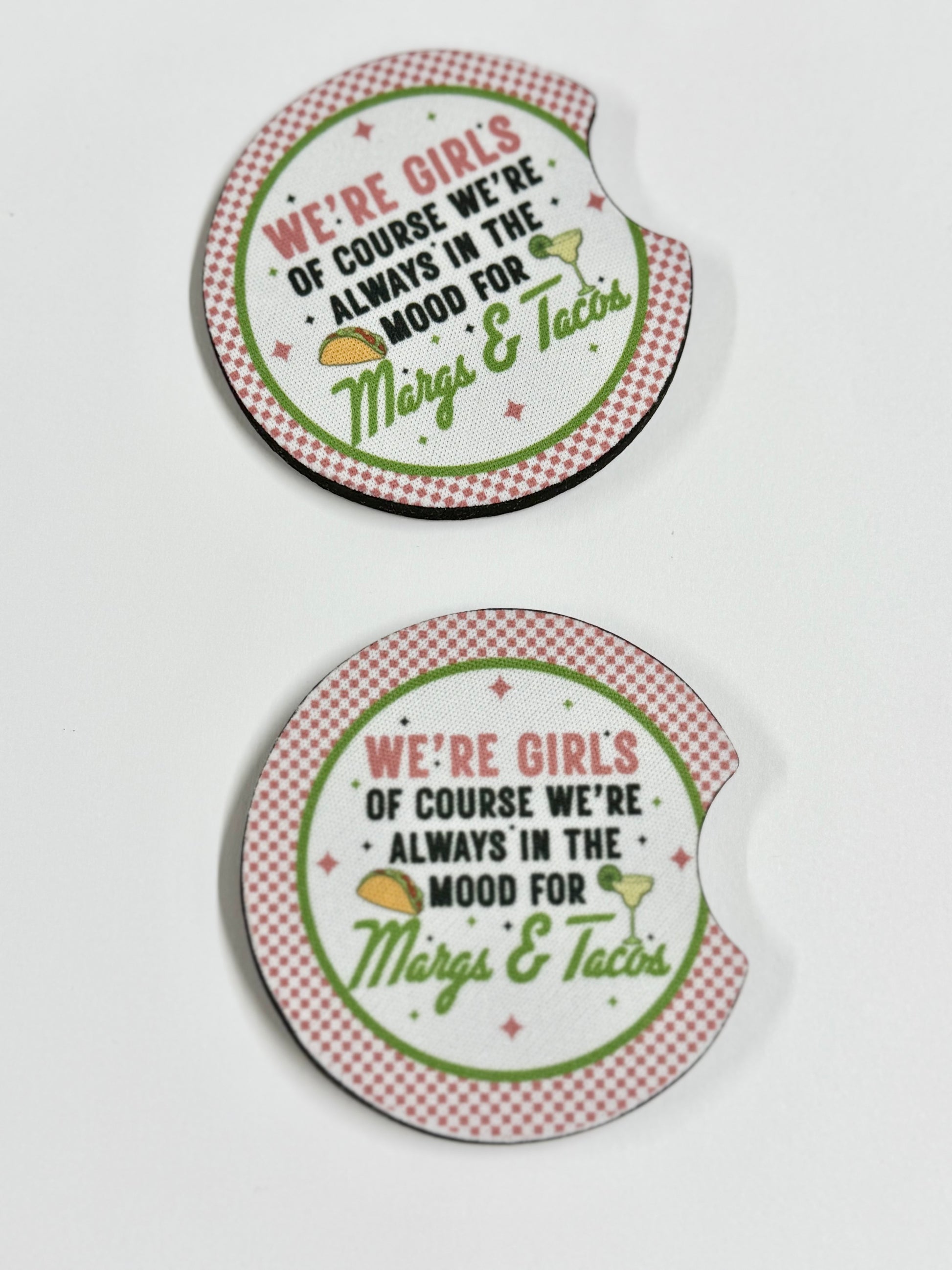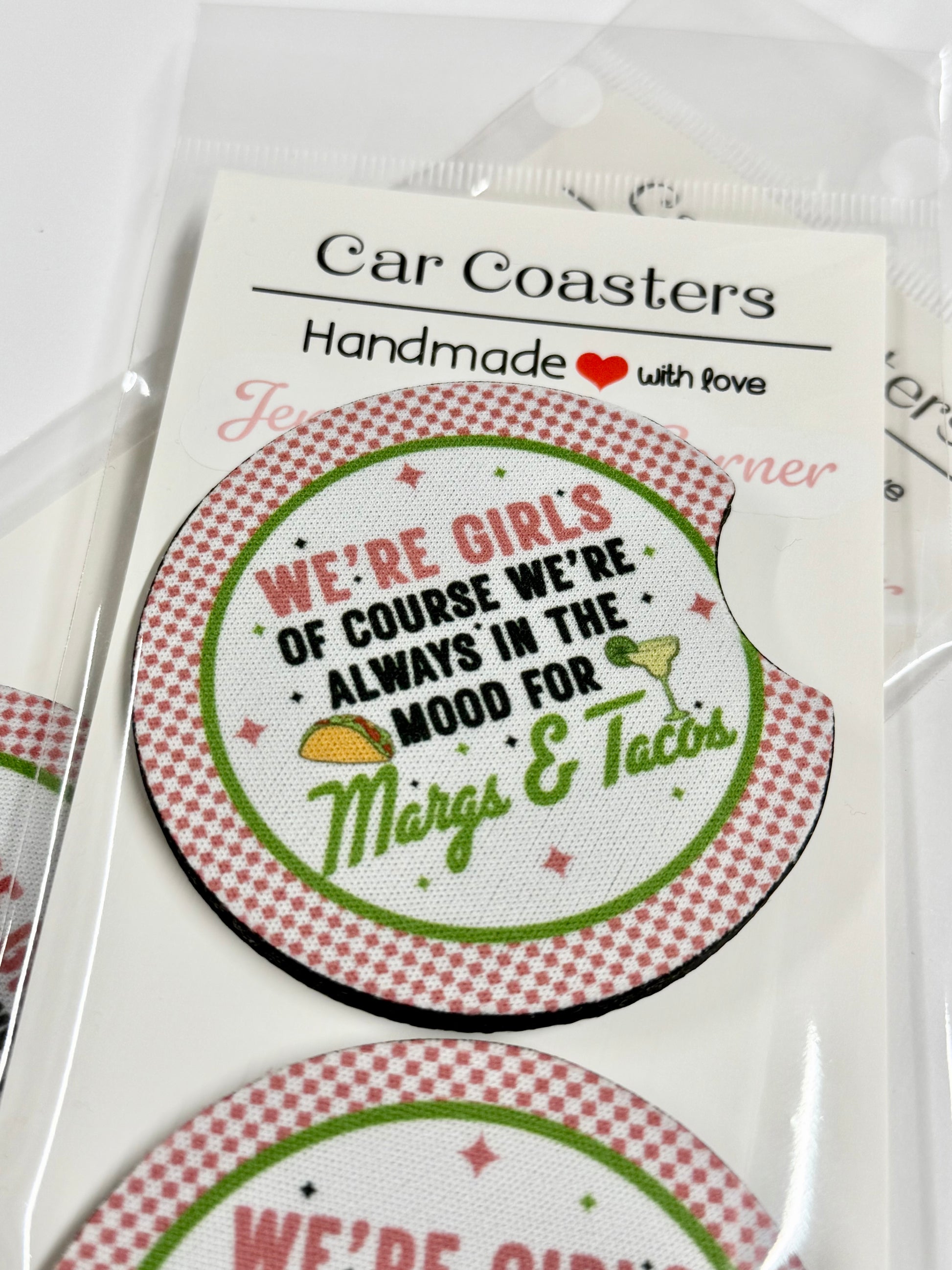 Because your car deserves a little fiesta too! This 'Margs & Tacos' car coaster set comes with two coasters and adds personality and laughter to every drive.