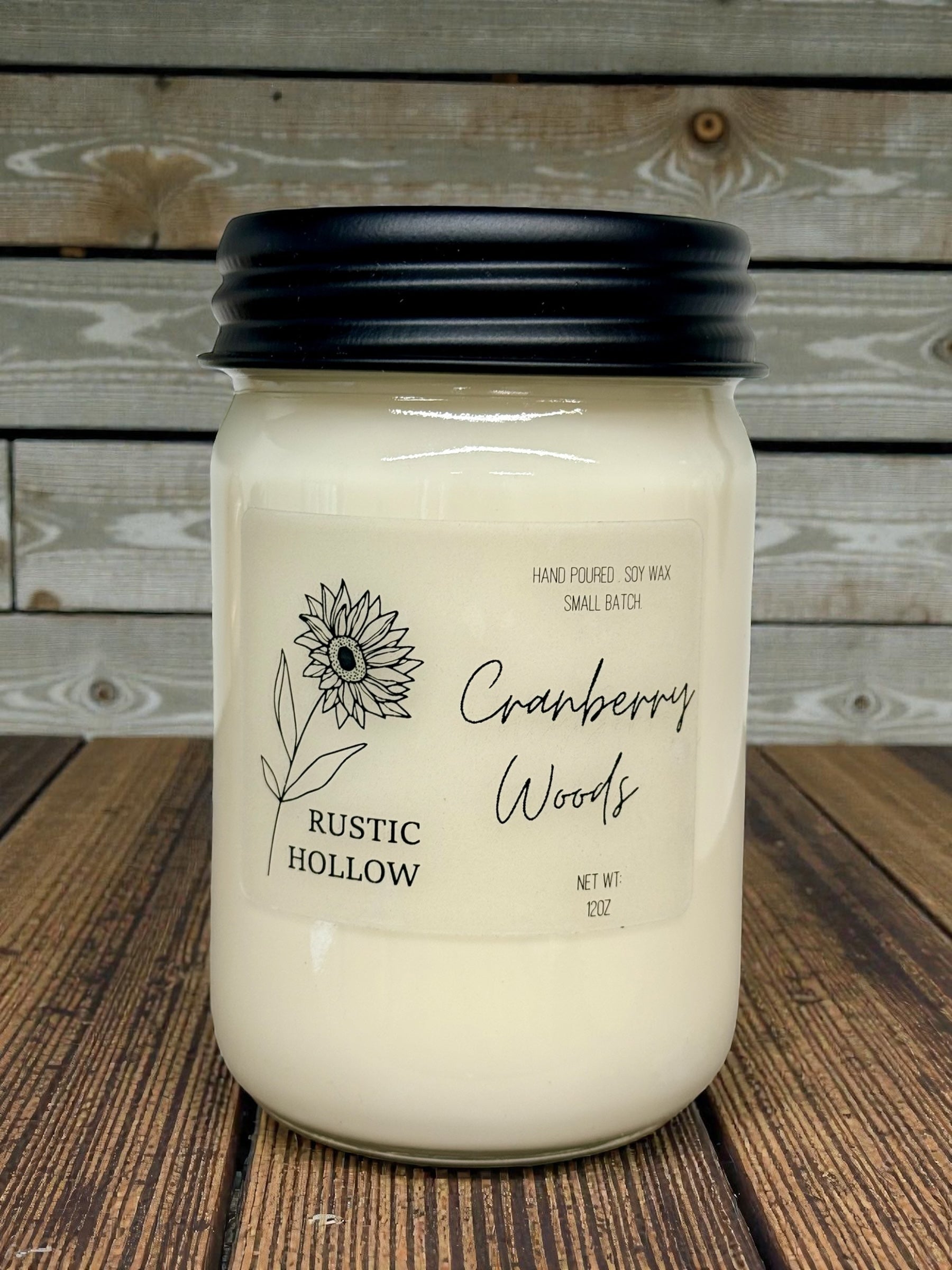Fill your space with the warm, inviting scent of Cranberry Woods. This 12oz jar candle from Rustic Hollow features a clear jar with a sleek black lid and hand-poured wax for a long-lasting, cozy burn. Perfect for adding a touch of rustic charm and seasonal fragrance to any room.