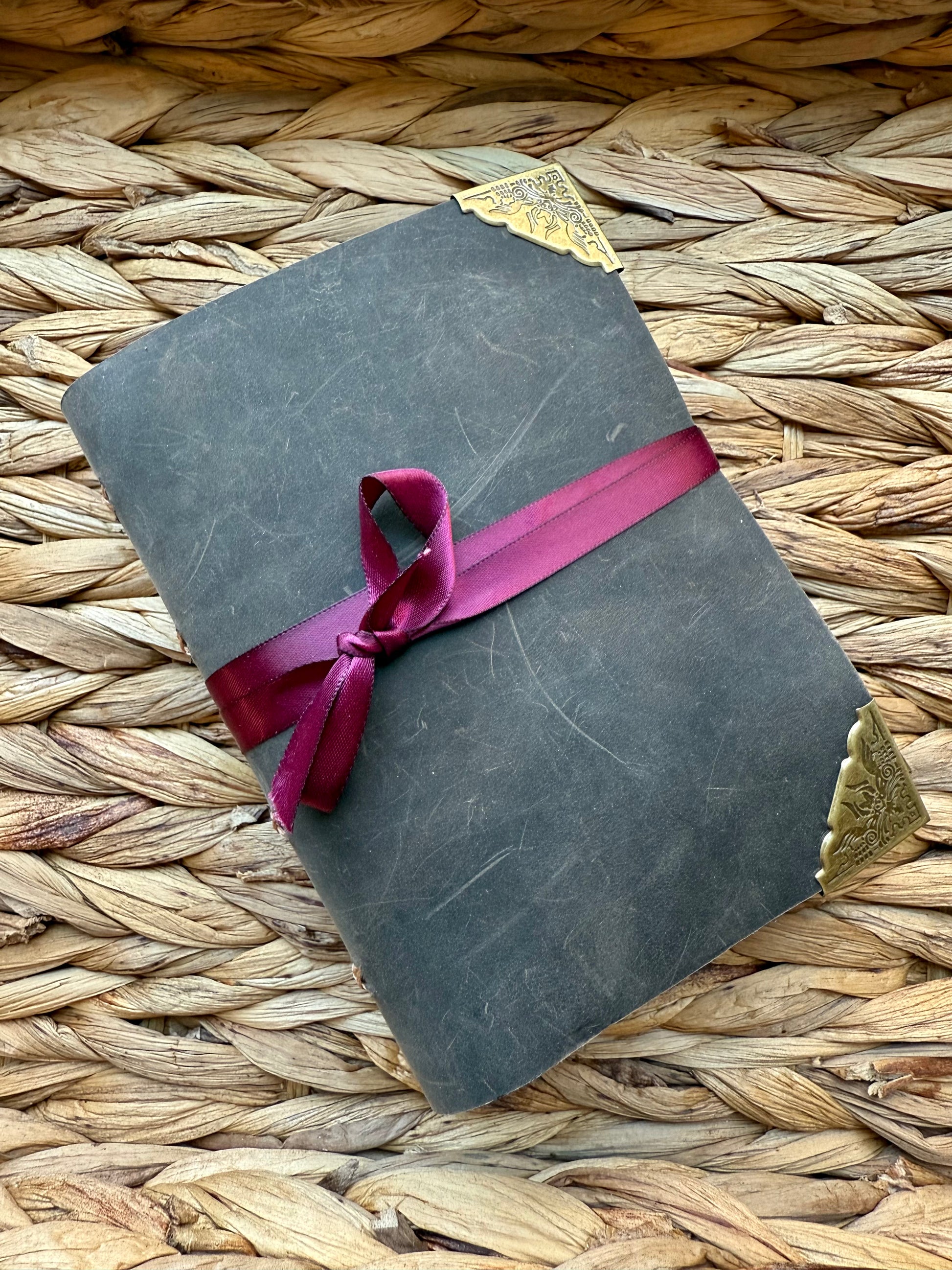 Crafted from rich brown cowhide leather, this hand-sewn journal features a striking maroon ribbon closure and lighter brown linen thread for a beautiful contrast in detail. Inside are 80 smooth, 68 lb pages — perfect for writing, sketching, or daily reflections. A timeless, handcrafted piece made to inspire.