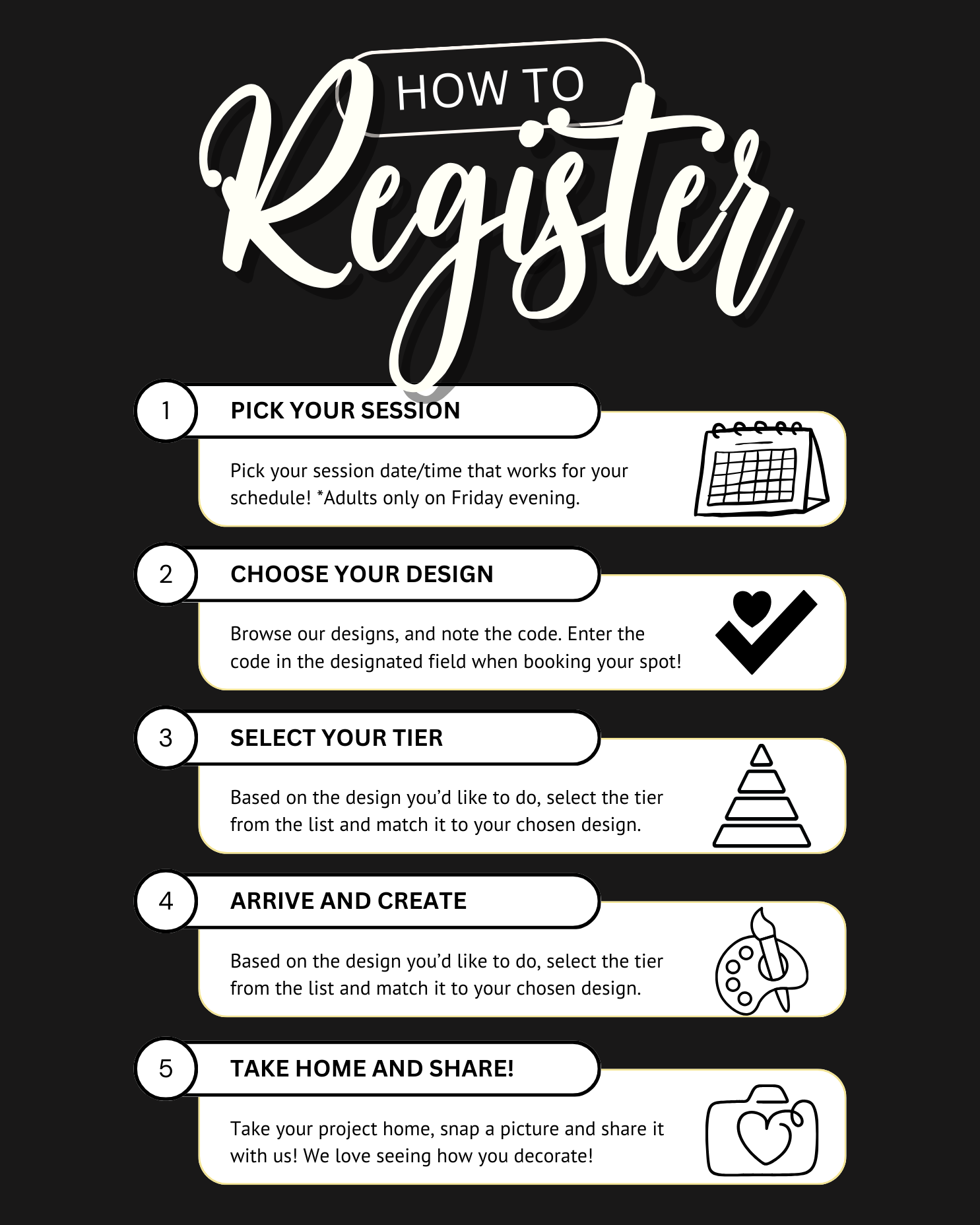 Pick your session, select your tier, and choose your design from our seasonal collection. Every project is precut and ready to paint - no experience needed! Perfect for a solo outing, date night, catching up with friends, or a fun family activity!