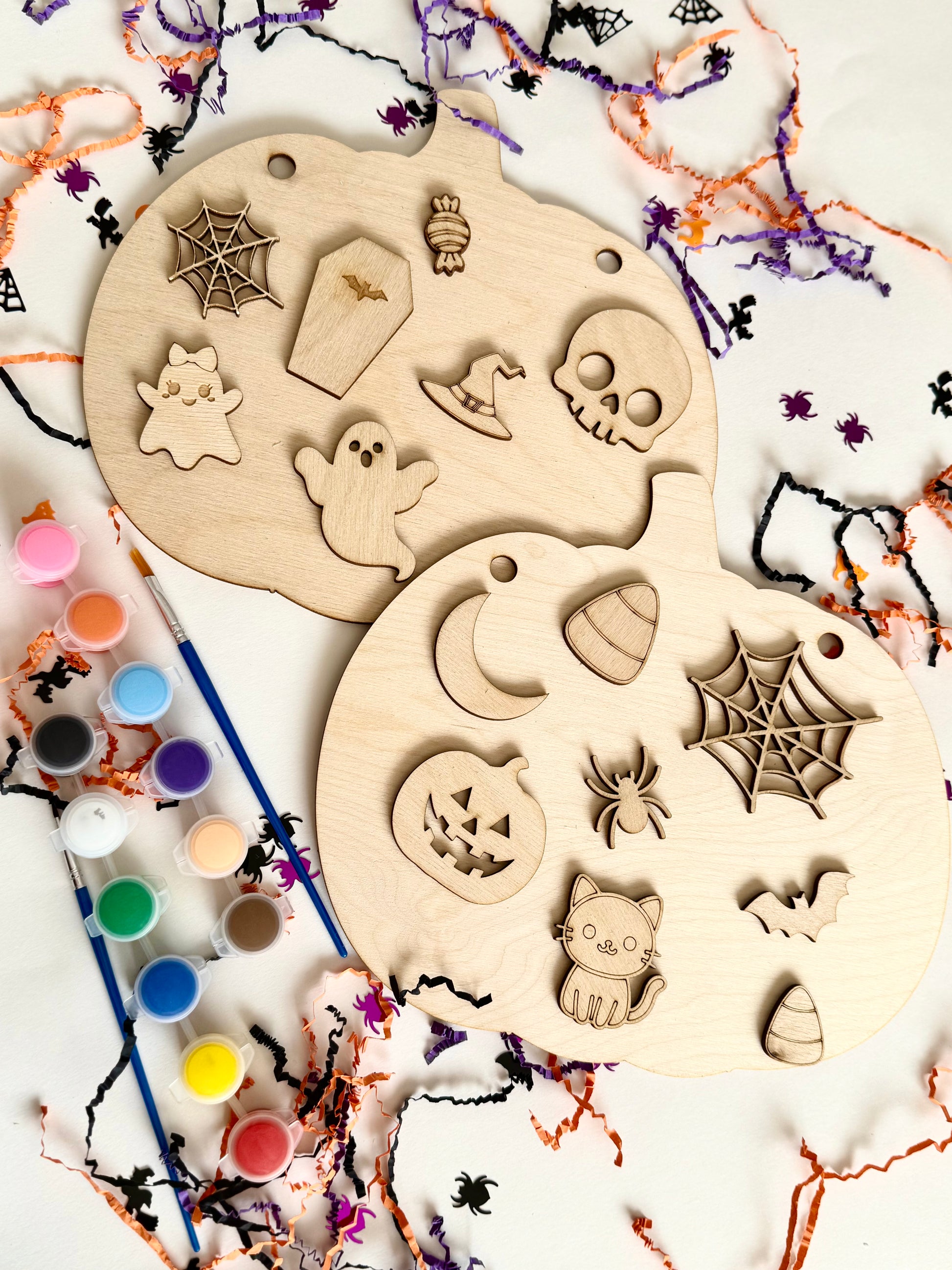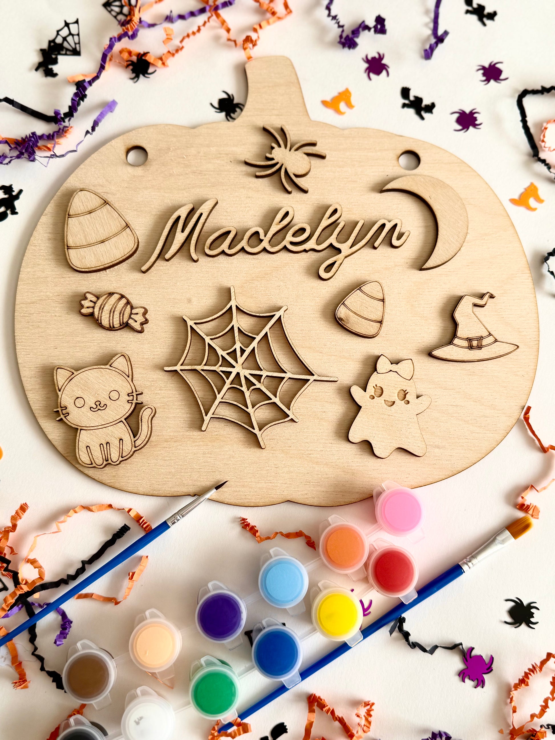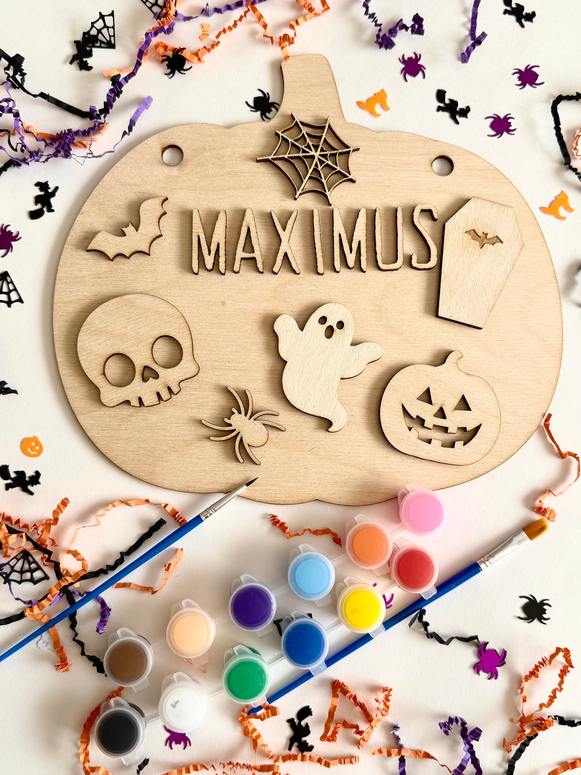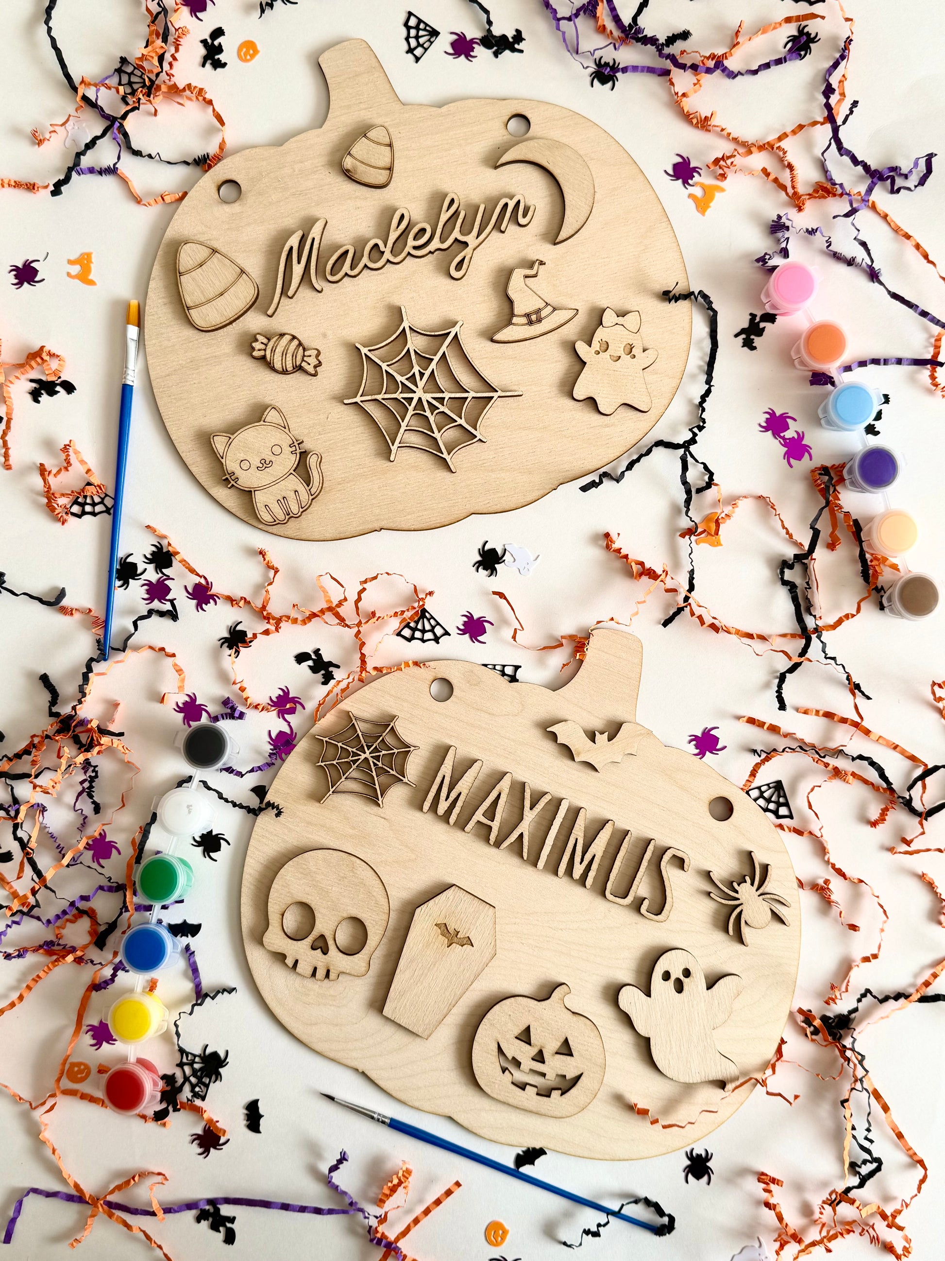 This wooden pumpkin sign comes ready for you to decorate with your name and fun Halloween charms. Perfect for kids (and kids at heart).