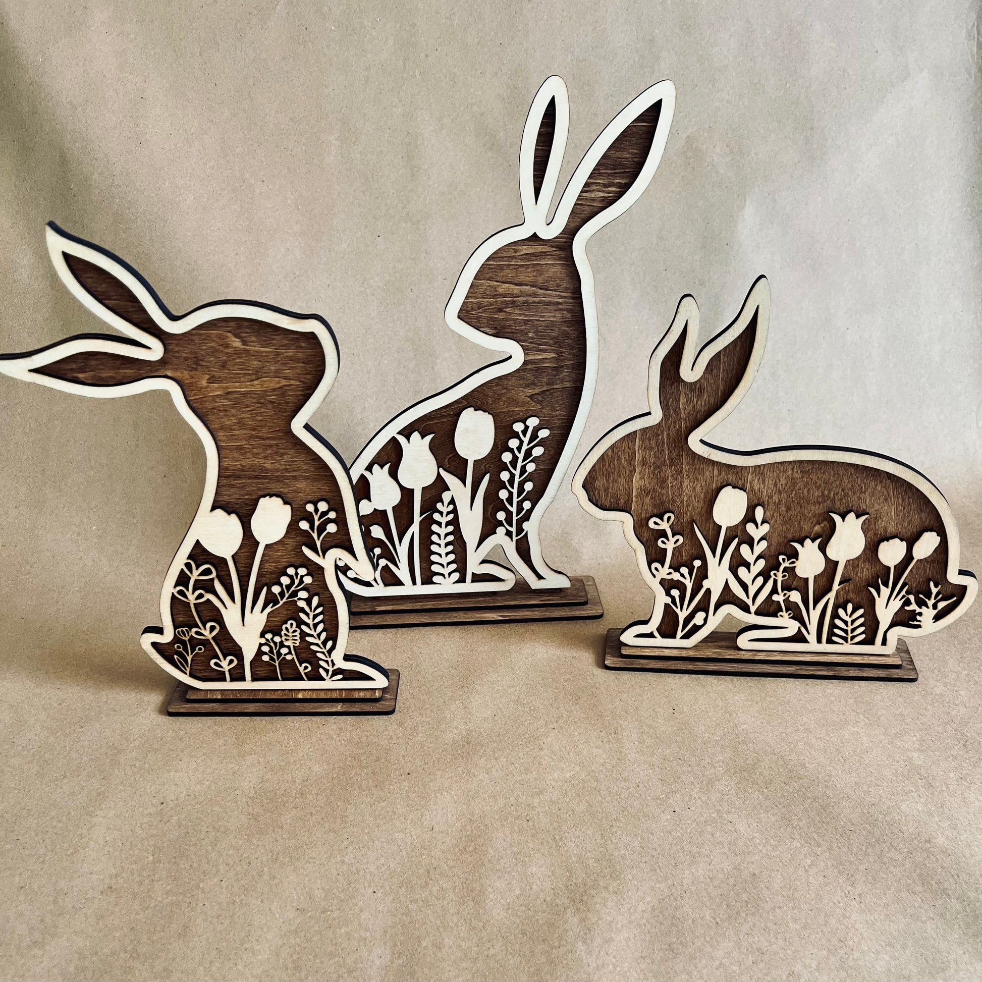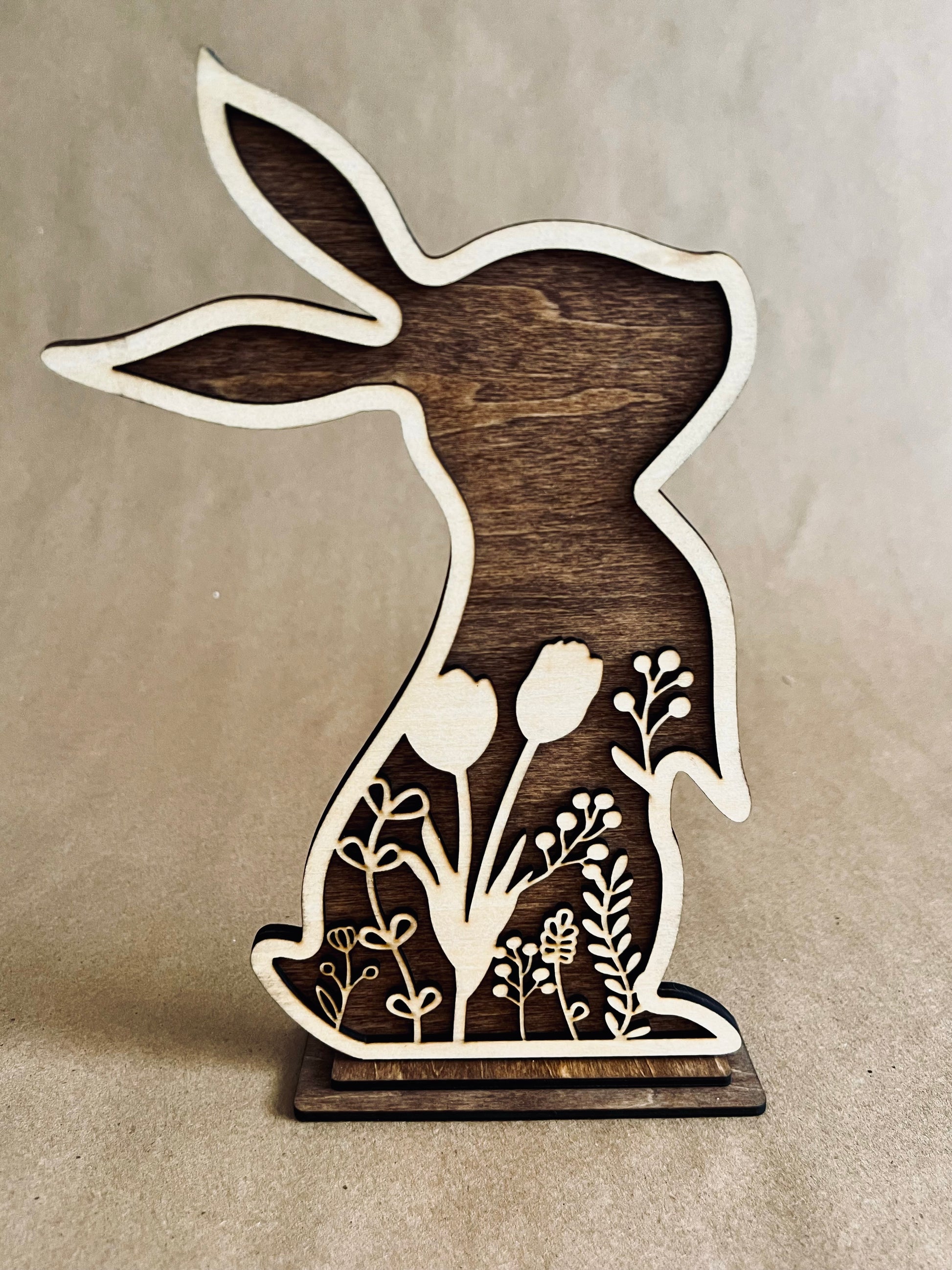 Ideal for showcasing on mantels, shelves, or as a centerpiece, this elegant rabbit decoration brings a festive yet sophisticated touch to your holiday celebrations. Whether you're looking to refresh your space for Easter or simply add a charming piece of spring-inspired décor, this laser-cut rabbit with floral cutouts is sure to be a standout in your home.