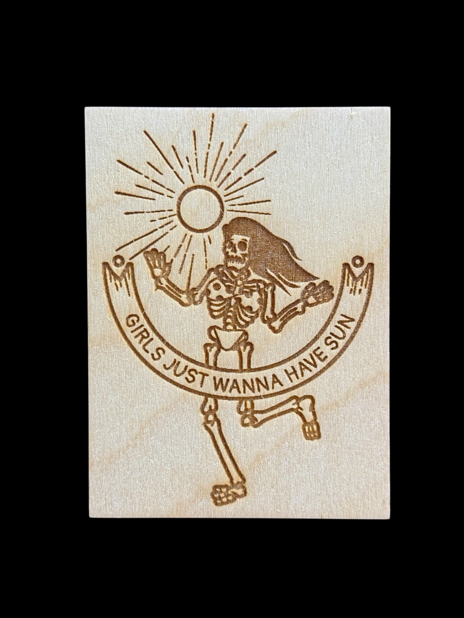 Bring some fun in the sun vibes to your space with this beachy girl skeleton wood magnet, engraved with the playful phrase Girls Just Wanna Have Sun. Crafted from natural wood, it’s the perfect mix of quirky charm and sunny spirit to brighten your fridge, locker, or workspace.