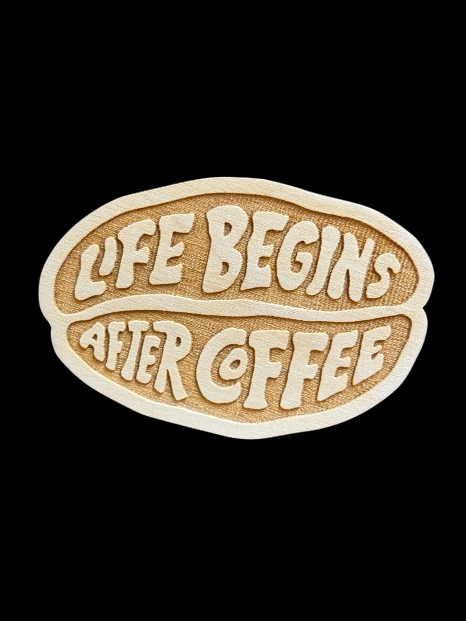 Celebrate your love for the perfect brew with this coffee bean-shaped wood magnet, engraved with Life Begins After Coffee. A fun and charming reminder that life really kicks off after that first cup—perfect for your fridge, office, or coffee nook.