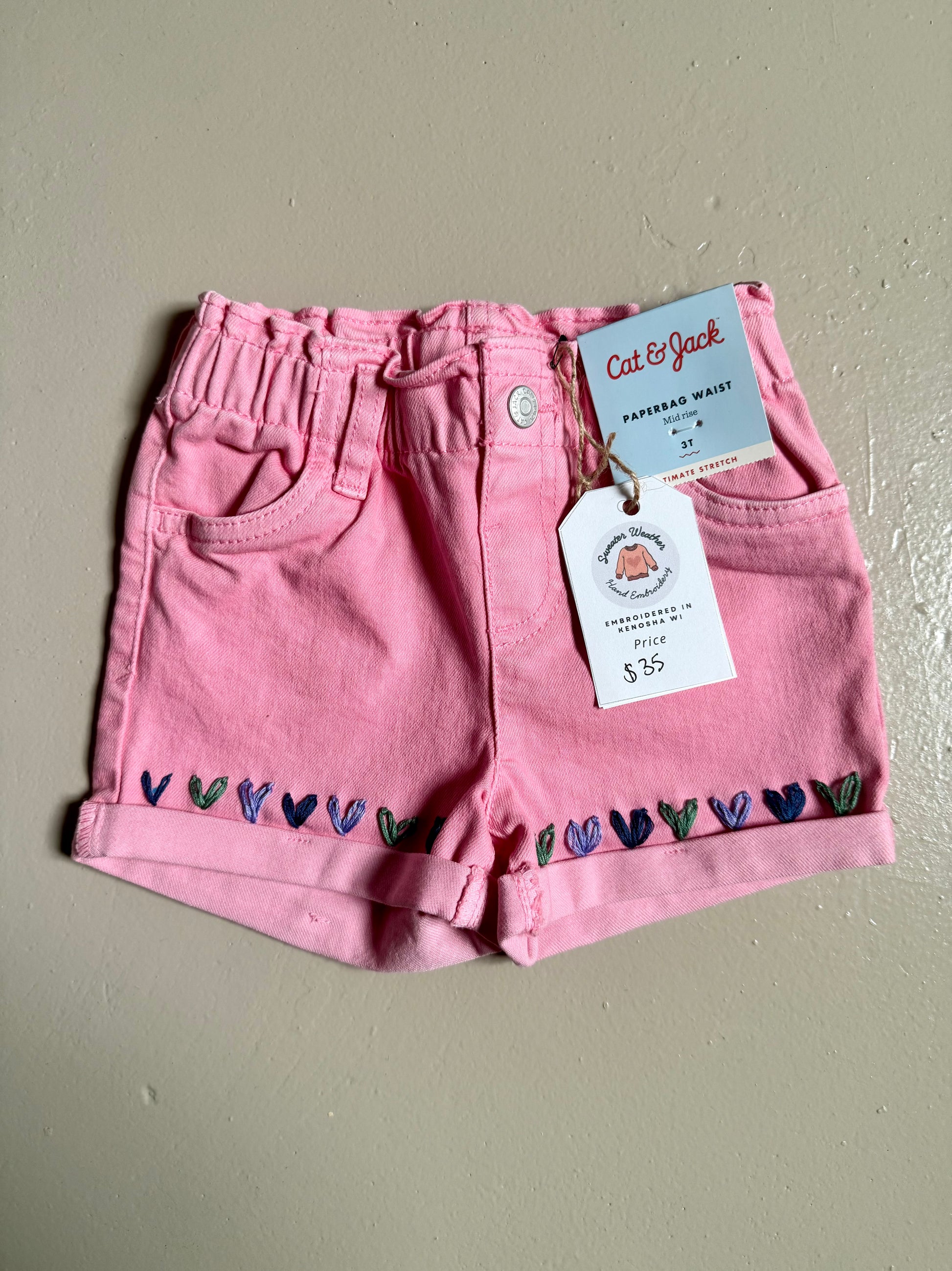 033 - Pink Floral Embroidered Denim Short 3T