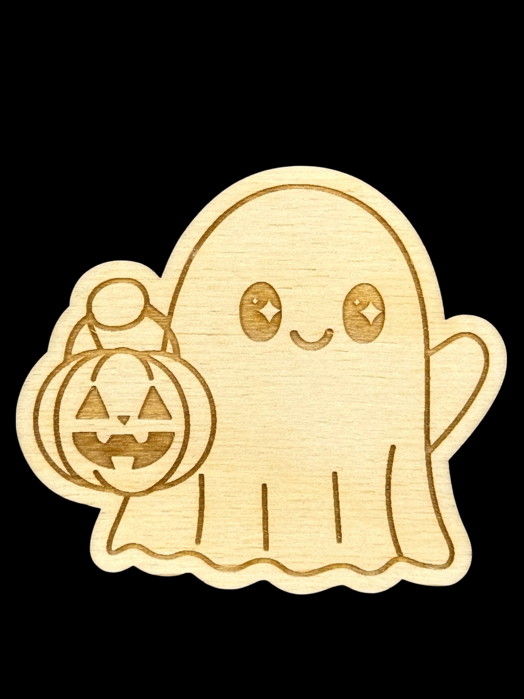 Sweet, spooky, and ready to go! This wood magnet features a little ghost holding a pumpkin bucket, perfect for trick-or-treat vibes on your fridge or magnet board. π»π
