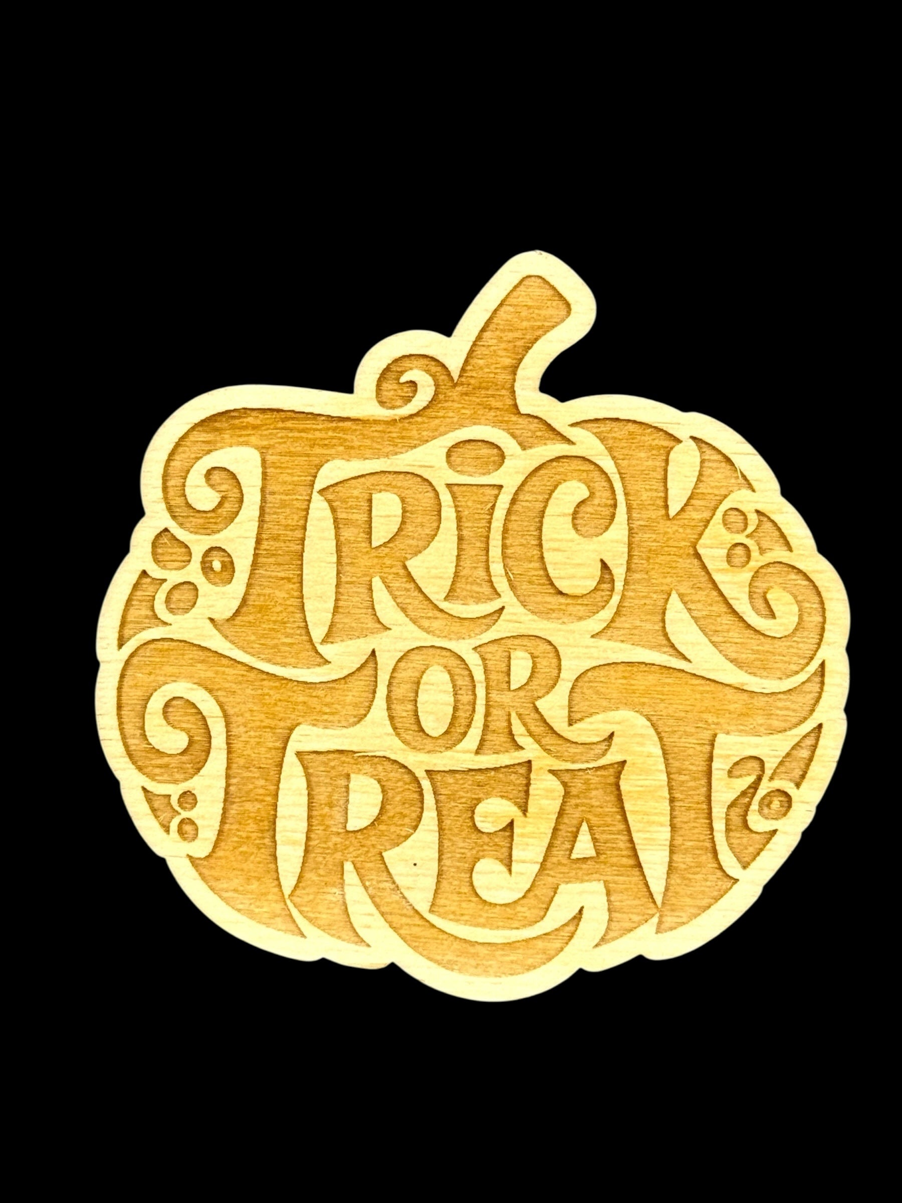 Pumpkin perfection! This wood magnet is shaped like a pumpkin with “Trick or Treat” laser engraved, adding a festive and slightly spooky touch to your fridge or magnet board. 🎃